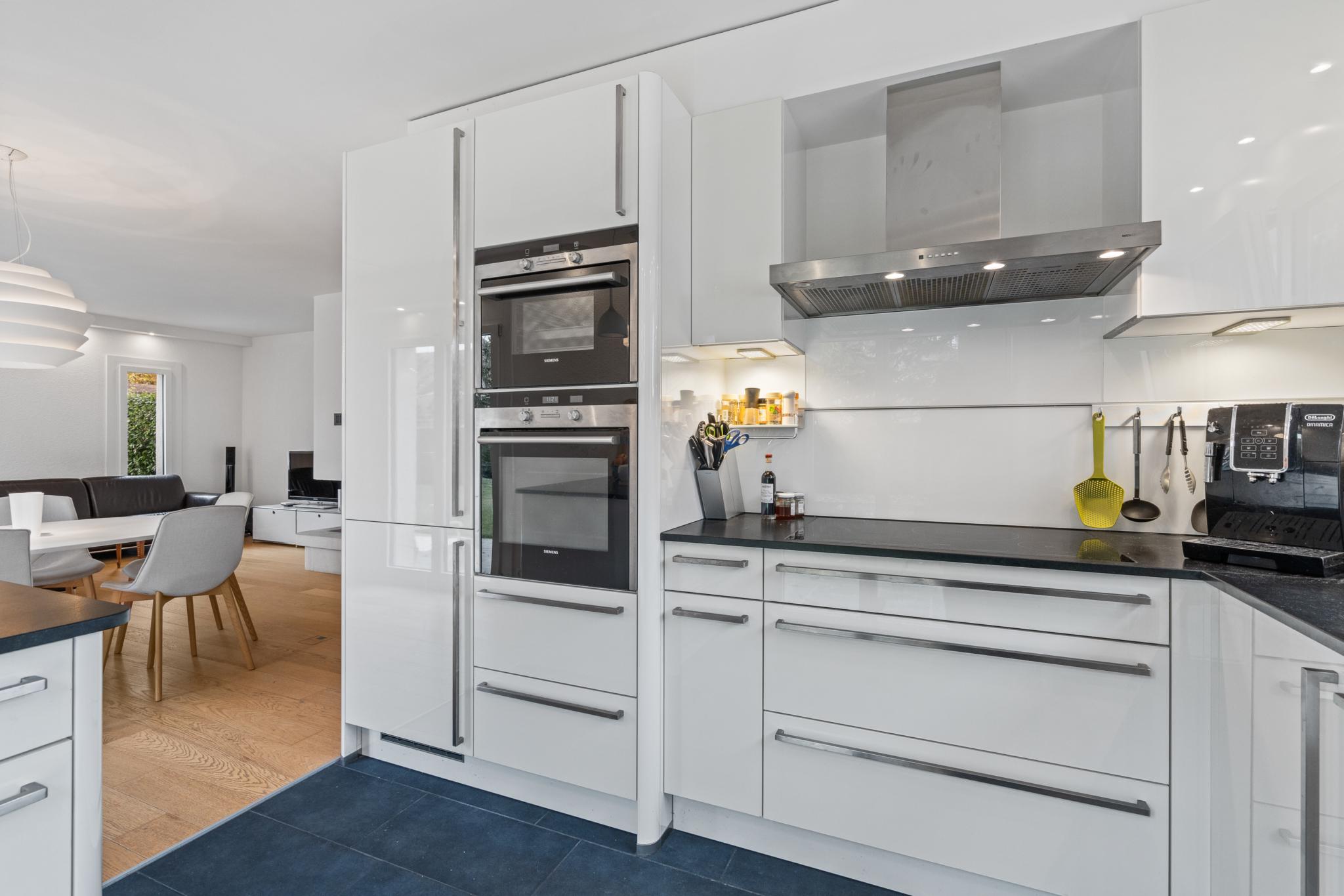 Rez: Hall d'entrée , wc visteurs, salon/ salle à manger avec cheminée, cuisine luxueusement équipée et ouverte sur la salle à manger, accès au jardin.